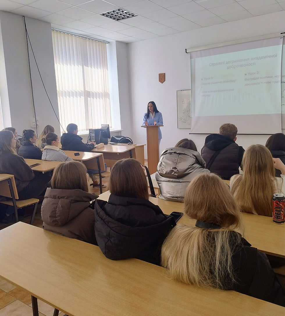 У рамках інтерактивної лекції учасники ознайомилися з основними поняттями академічної доброчесності, видами порушень та їх наслідками. Особливу увагу було приділено практичним аспектам запобігання плагіату та відповідальності за недоброчесну поведінку.